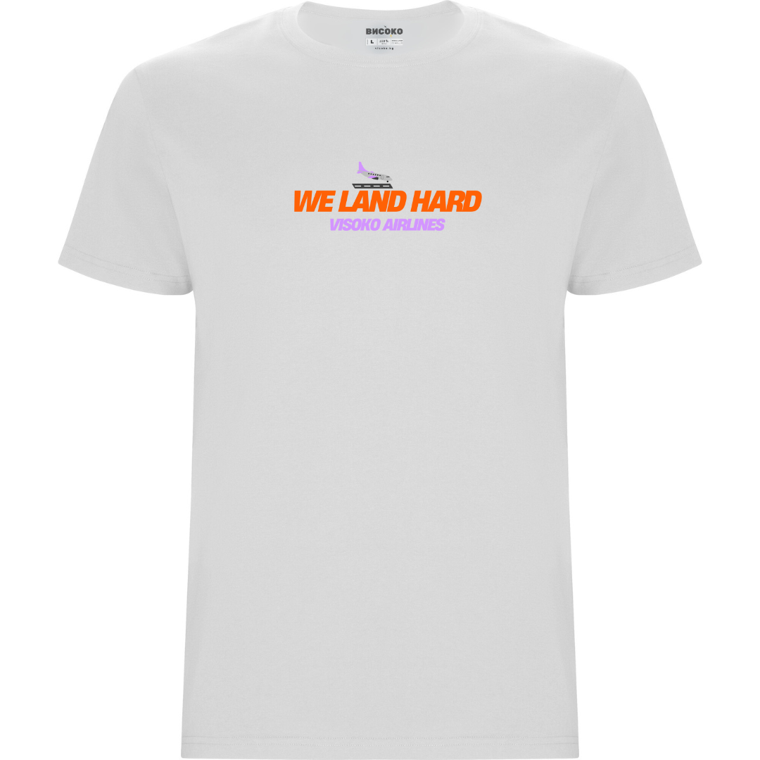 Мъжка тениска - Бяло - WE LAND HARD - VISOKO AIRLINES