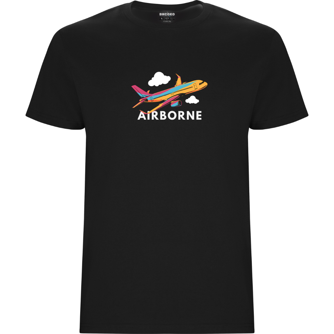 Черна памучна тениска с цветен принт на излитащ самолет и надпис “AIRBORNE”. Дизайнът е вдъхновен от авиацията и любовта към пътуването. Подходяща за ежедневно носене и за всички, които харесват самолетите и полетите.