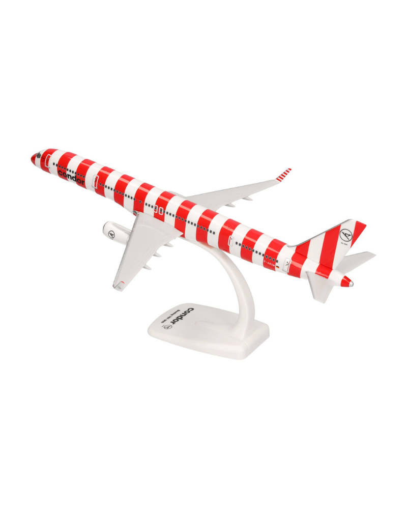 Този впечатляващ модел на Boeing 757-300 в мащаб 1:200 пресъздава една от най-разпознаваемите ливреи на Condor – ярките и смели райета, вдъхновени от плажната кърпа. Самолетът с регистрация D-ABOM е оцветен в страстно червено, символизирайки емоцията и динамиката на пътуването.